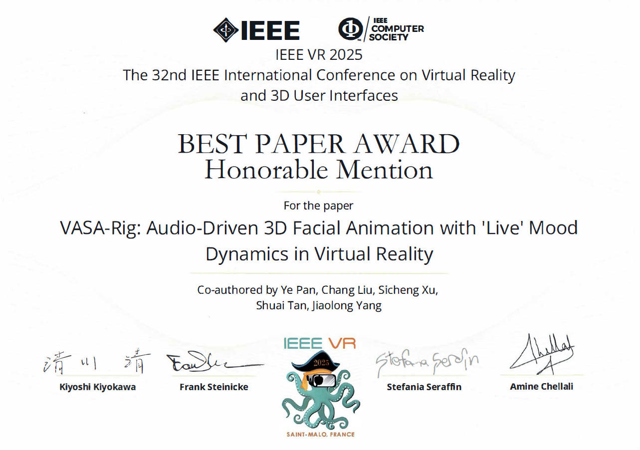 Ye Pan, Chang Liu, Sicheng Xu, Shuai Tan, Jiaolong Yang$ VASA-Rig: Audio-Driven 3D Facial Animation with 'Live' Mood Dynamics in Virtual Reality IEEE Conference on Virtual Reality and 3D User Interfaces (VR2025) (& IEEE TVCG) (Best Paper Honorable Mention Award) [Abstract] [BibTex] [PDF] [Webpage] [Suppl. Material] [arXiv] |